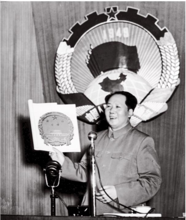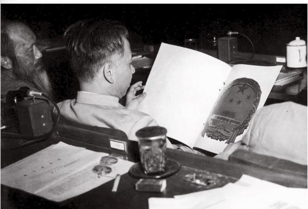 1950年6月23日,在中国人民政治协商会议第一届全国委员会第二次会议上,毛主席正在向委员会展示国徽图案