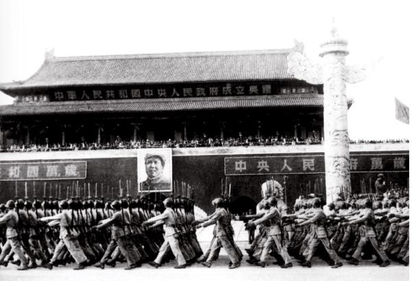 1949年10月1日,开国大典中,受阅的步兵方阵正通过天安门广场,由于国徽“难产”,天安门城楼上未能悬挂代表新中国的国徽,只能用横标替代